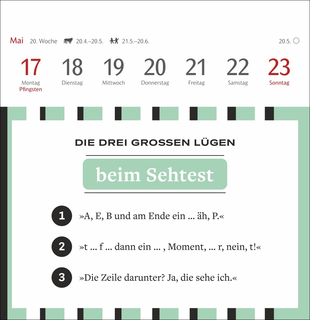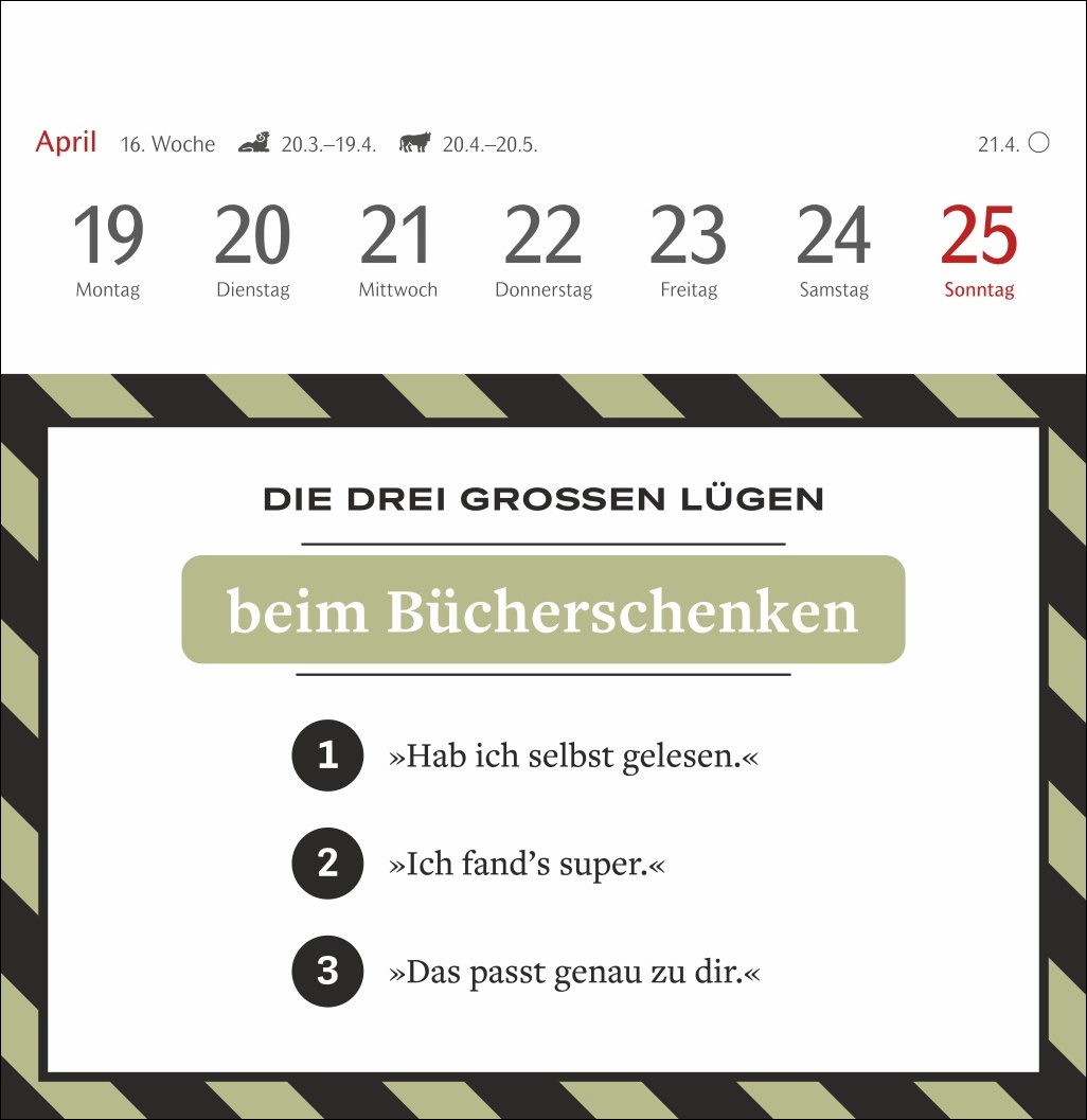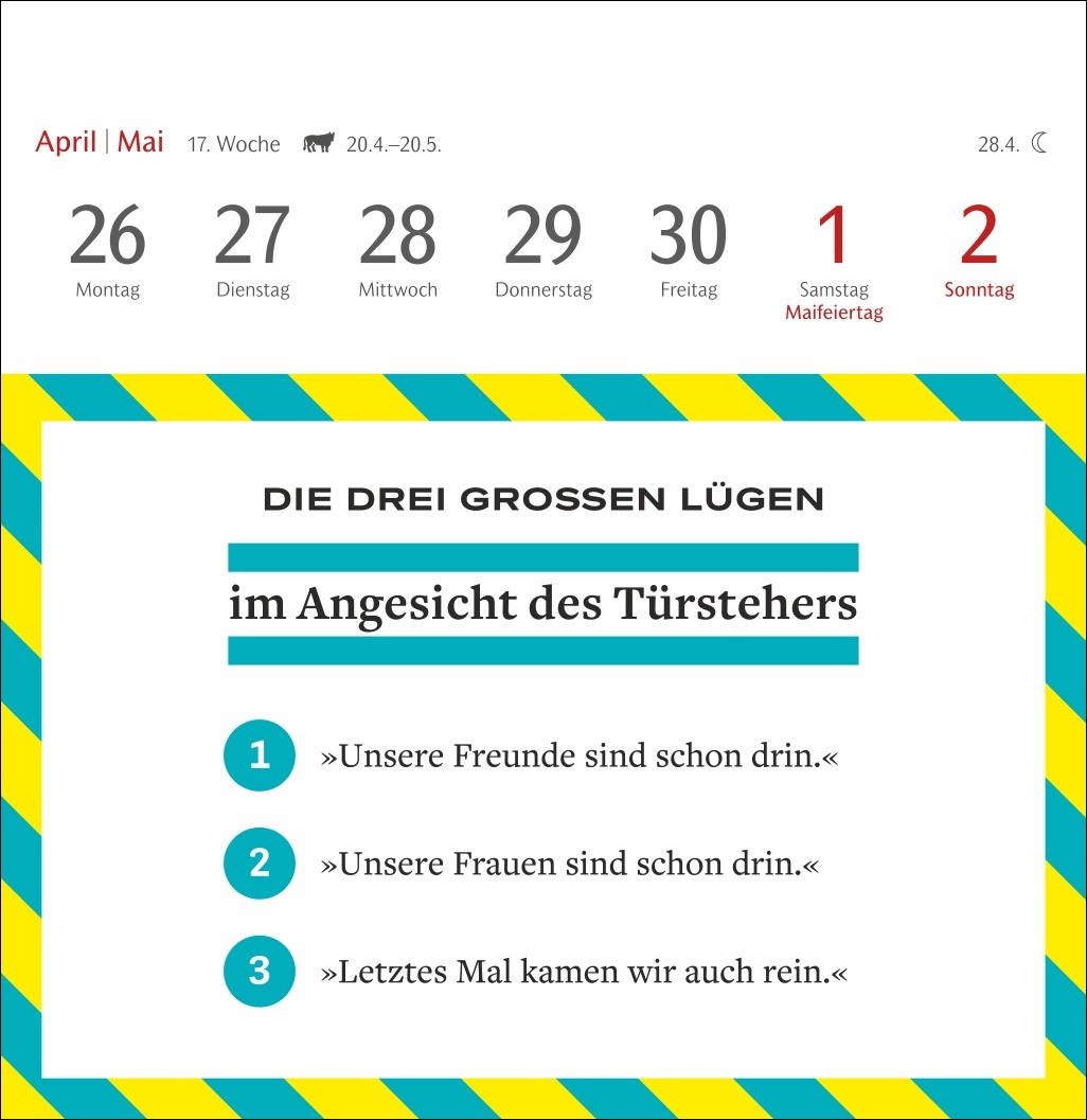 - Basierend auf der beliebten Kolumne „Die drei großen Lügen“ des SZ-Magazins: witziger Wochenkalender mit Postkarten zum Sammeln, Schmunzeln und Verschicken