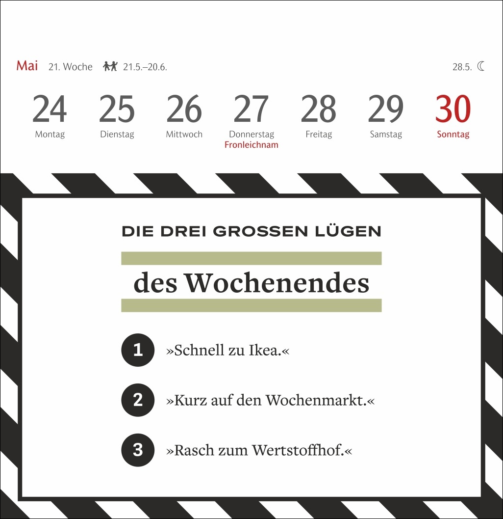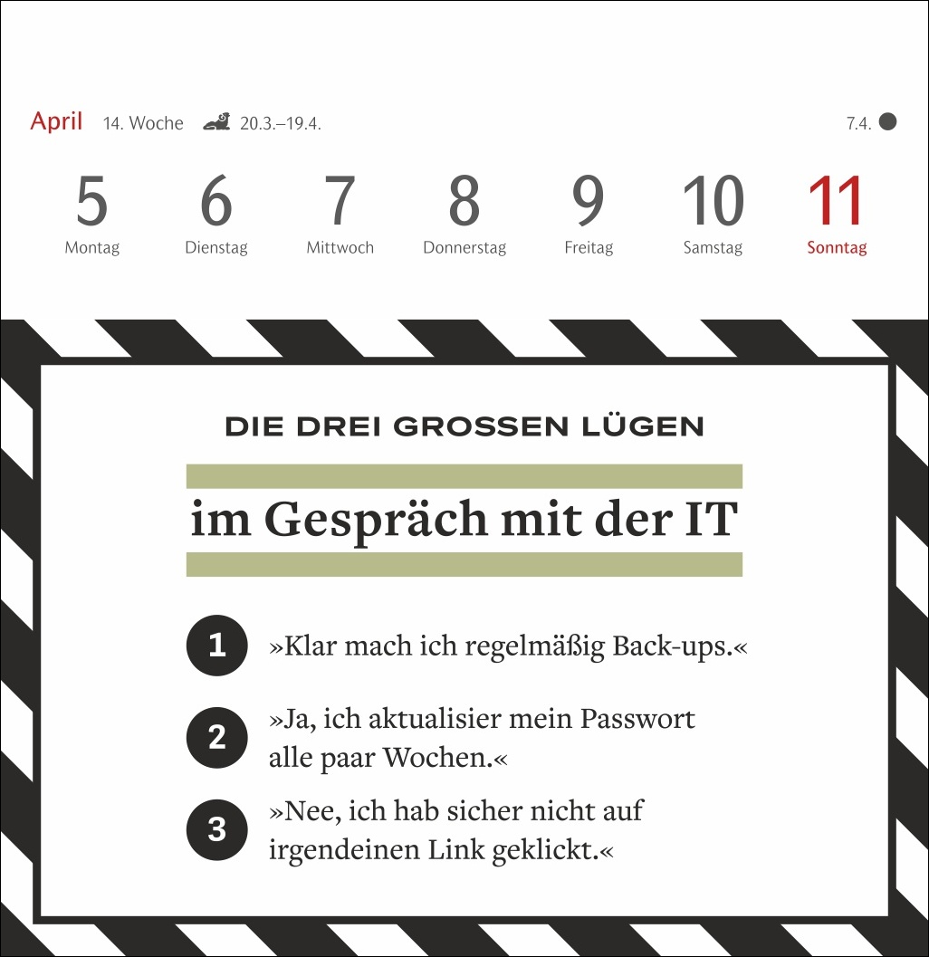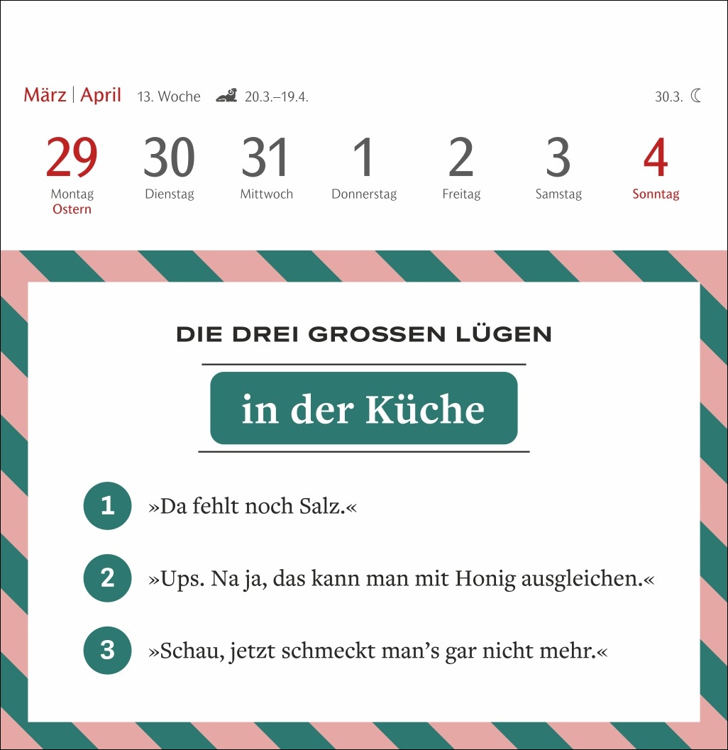 - Basierend auf der beliebten Kolumne „Die drei großen Lügen“ des SZ-Magazins: witziger Wochenkalender mit Postkarten zum Sammeln, Schmunzeln und Verschicken
