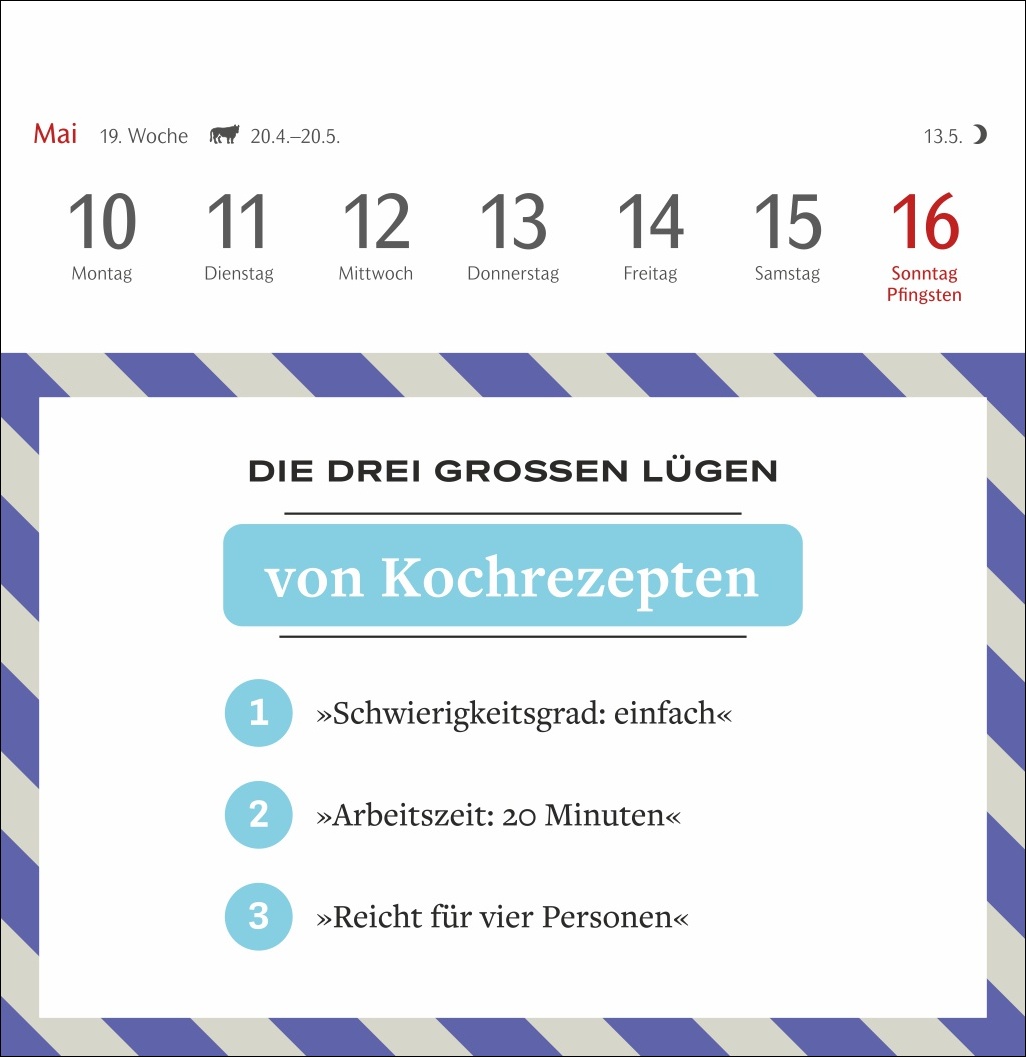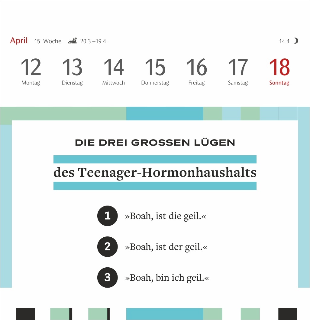 - Für alle Fans von Satire und feinem Humor: Der Postkarten-Kalender mit Wochenkalendarium, Feiertagen, Sternzeichen und Mondphasen