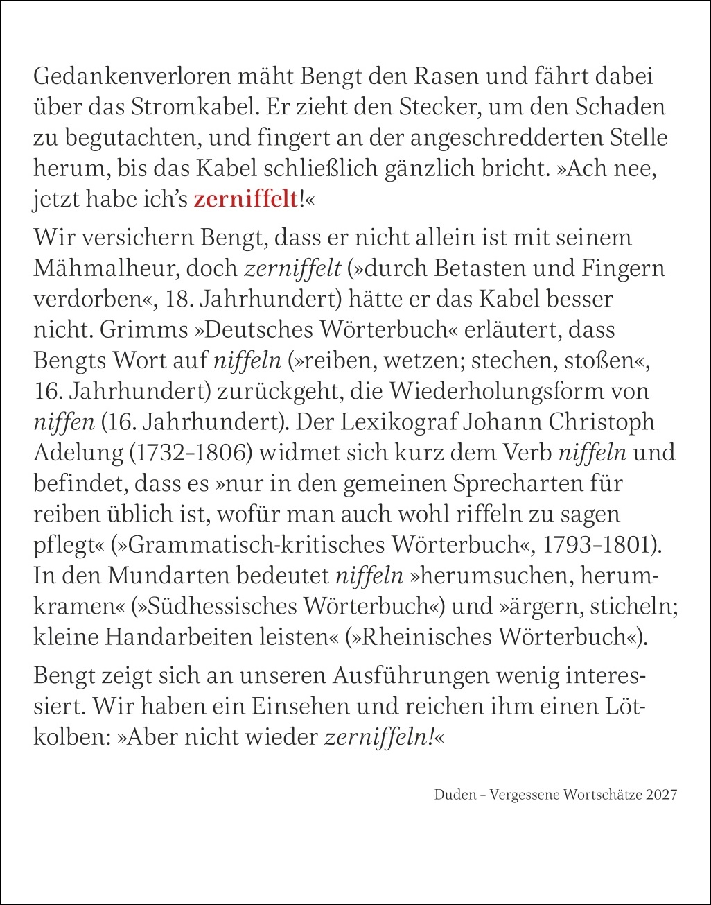 - Tageskalender zum Abreißen mit über 300 Kleinoden aus dem deutschen Wortschatz, Ausflügen in die Sprachhistorie und unterhaltsamen Anekdoten