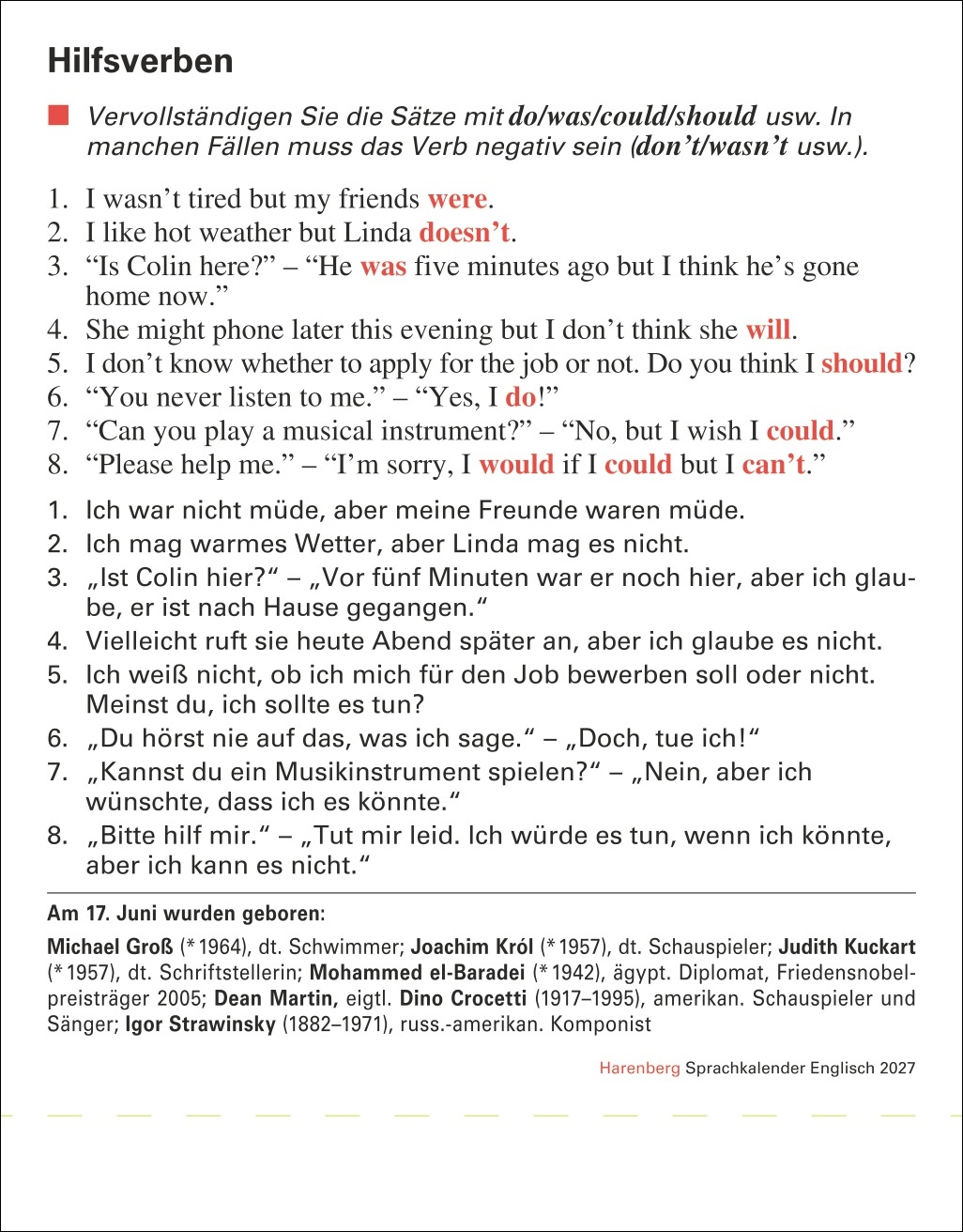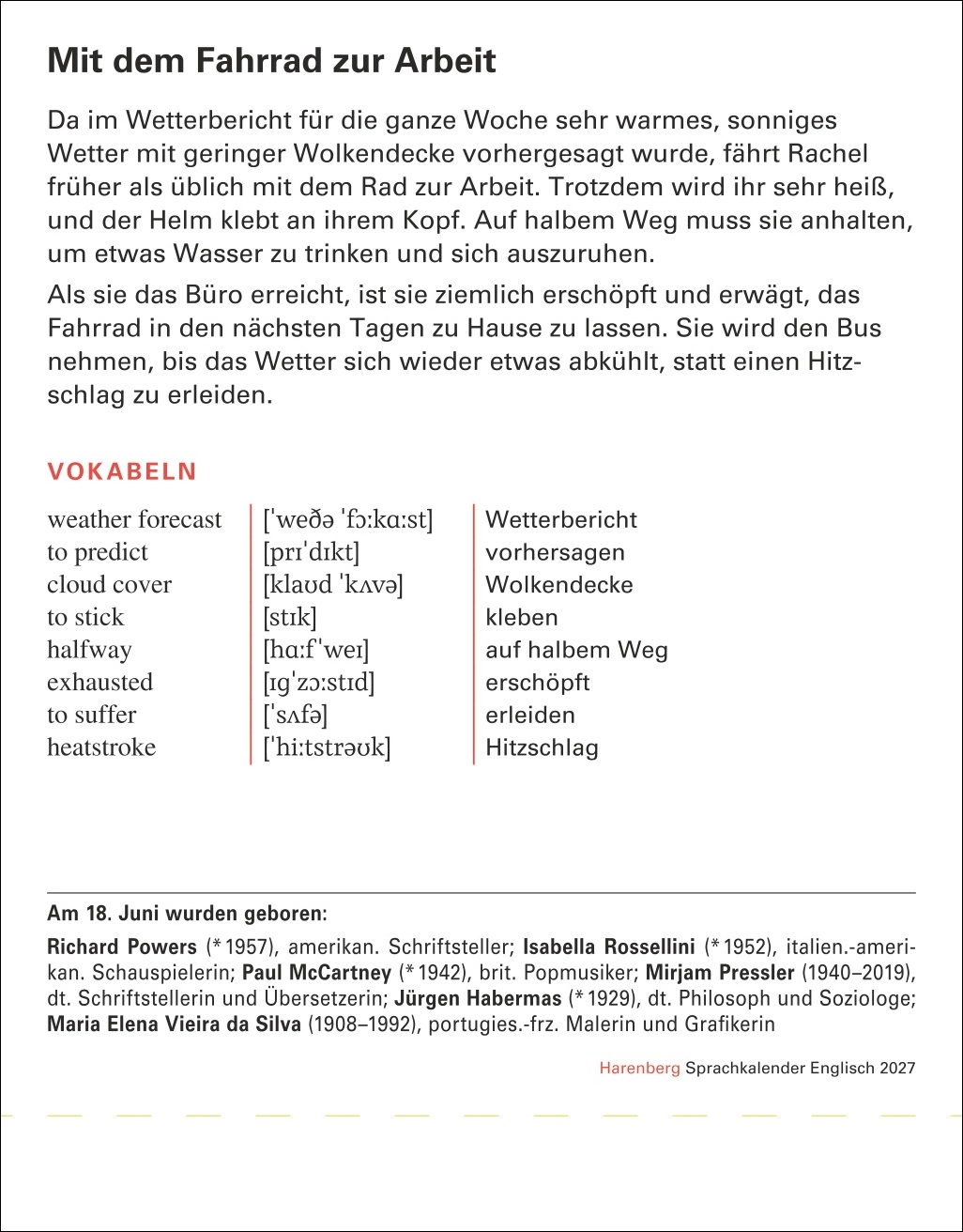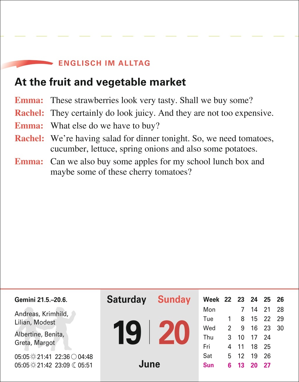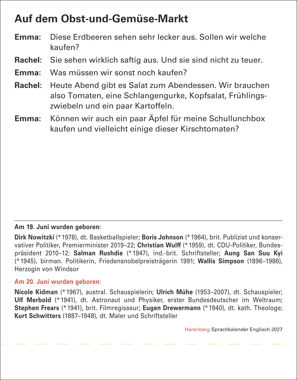 • Ein Abreißkalender mit mehr als 600 Seiten Alltagsdialogen, Landeskunde, verständlich erklärter Grammatik und abwechslungsreichen Übungen