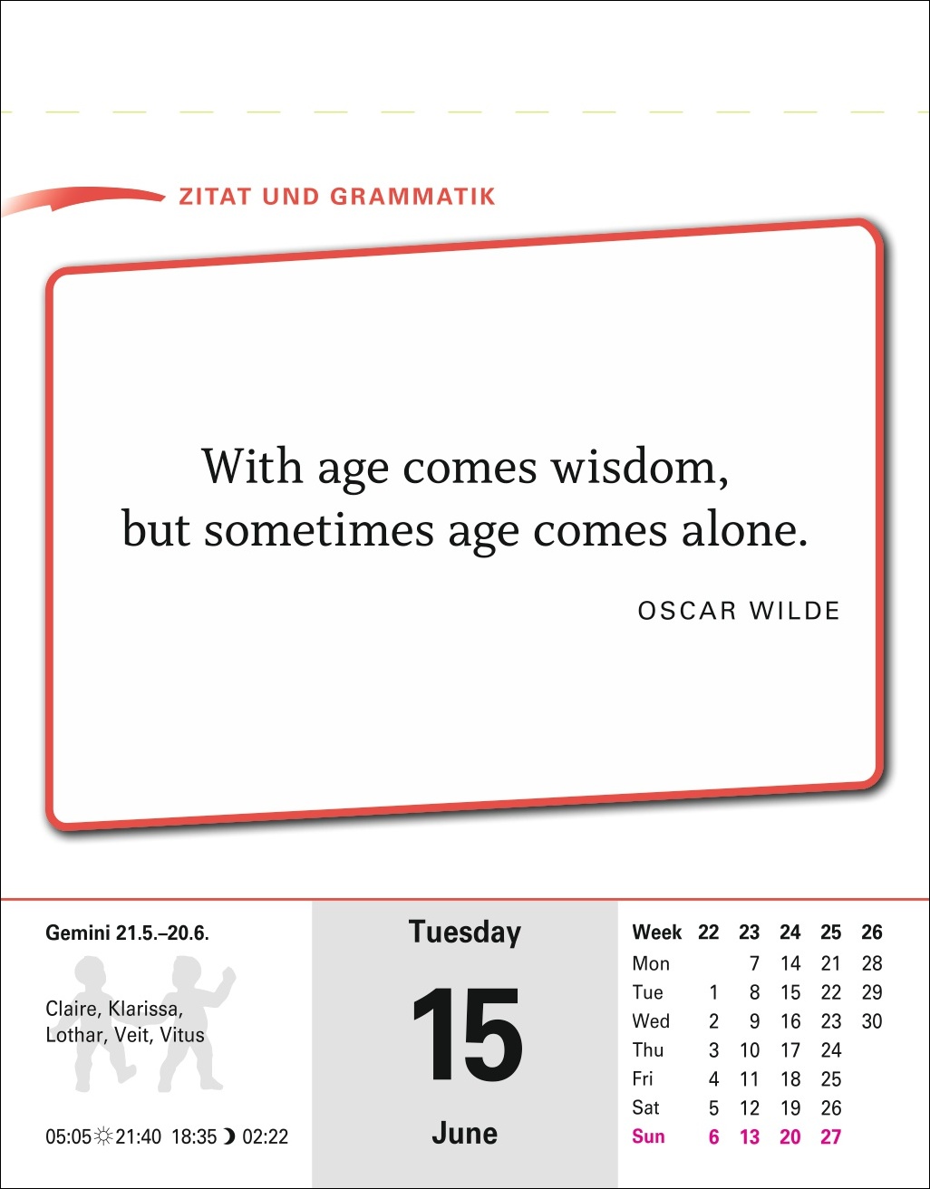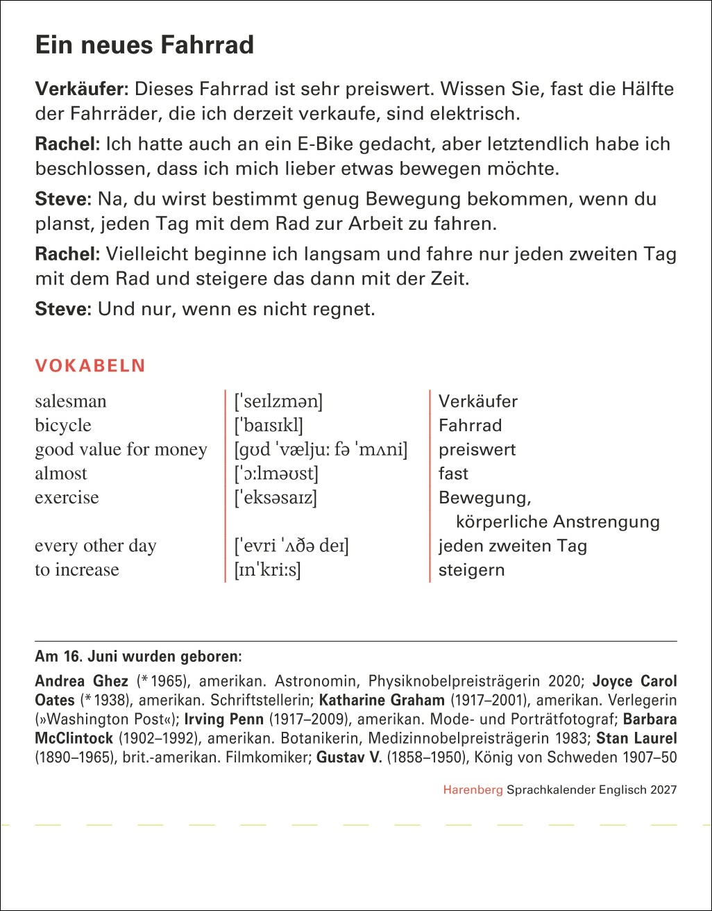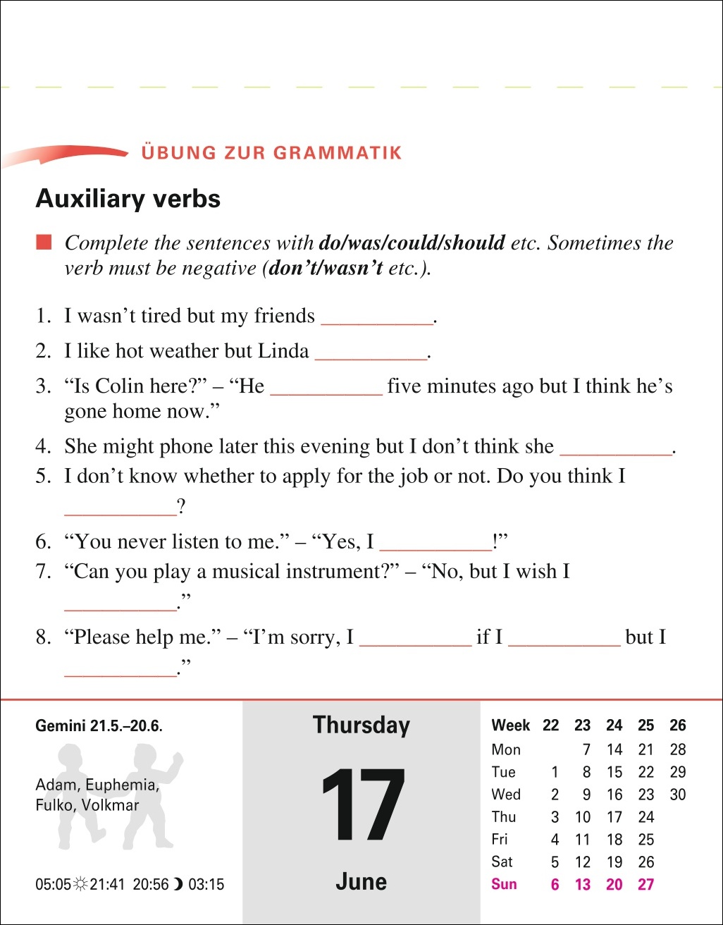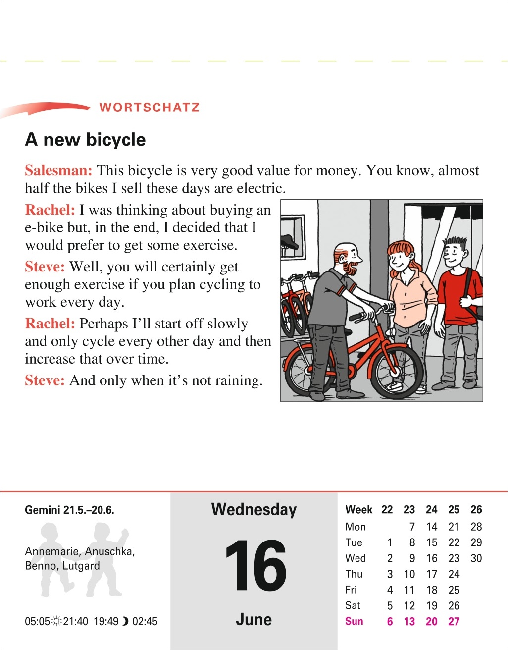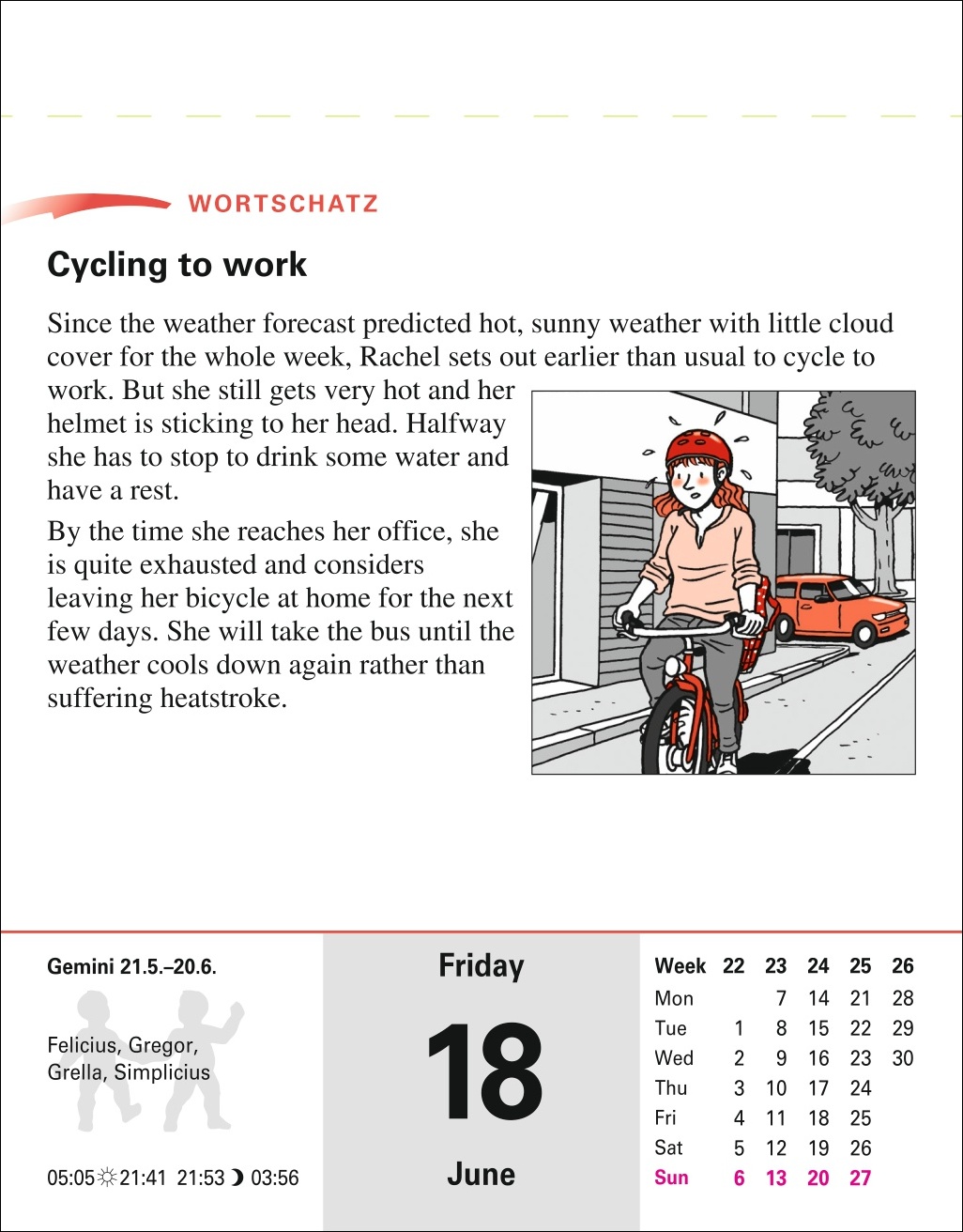 • Ein Abreißkalender mit mehr als 600 Seiten Alltagsdialogen, Landeskunde, verständlich erklärter Grammatik und abwechslungsreichen Übungen