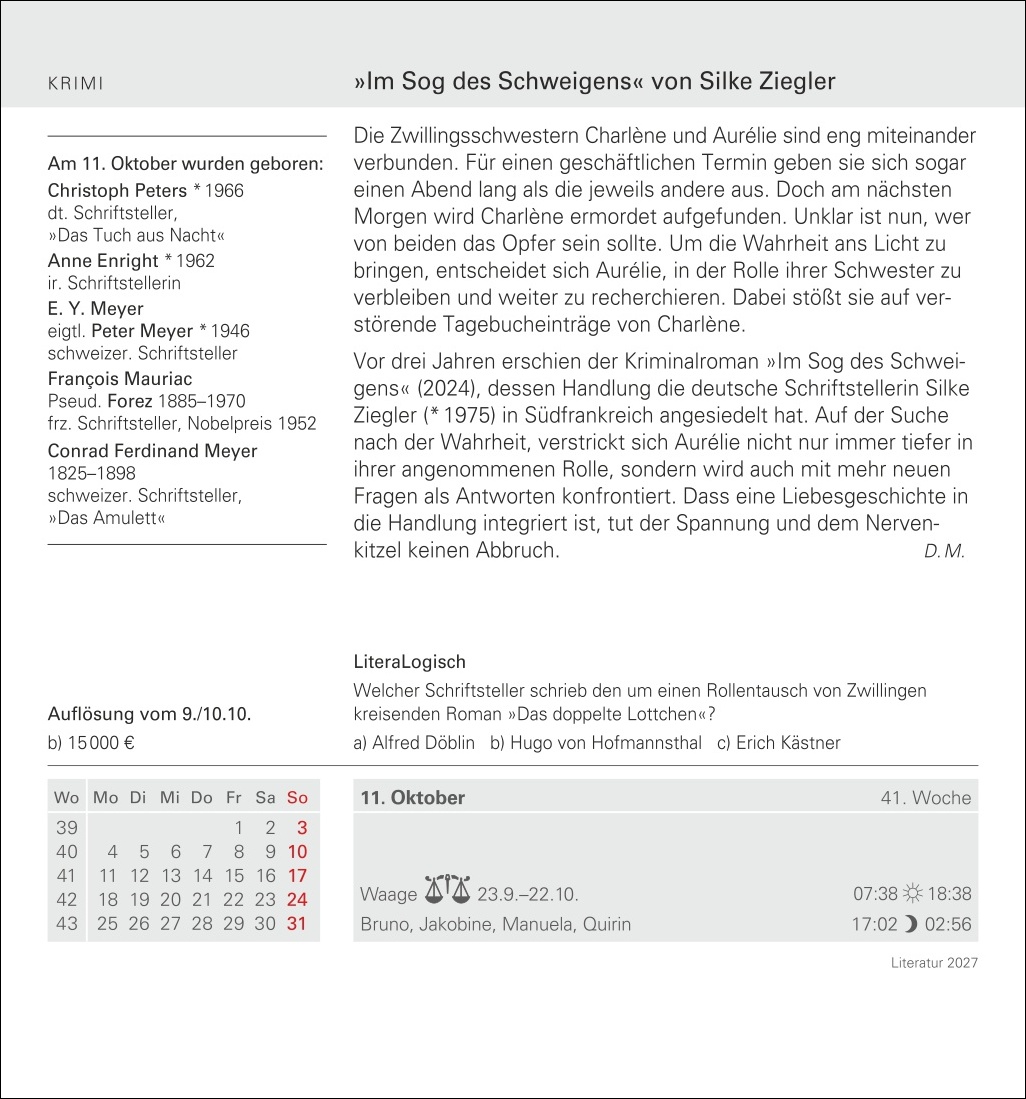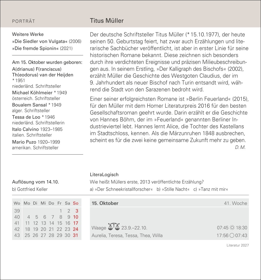 • Auf Streifzug durch die Welt der Bücher: Tischkalender mit Lesetipps aus allen Genres, spannenden Porträts von Autorinnen und Autoren, Klassiker und Newcomer der Literaturszene