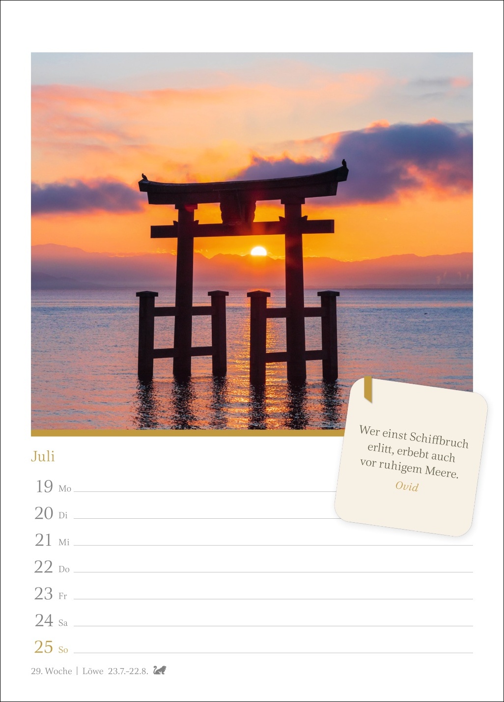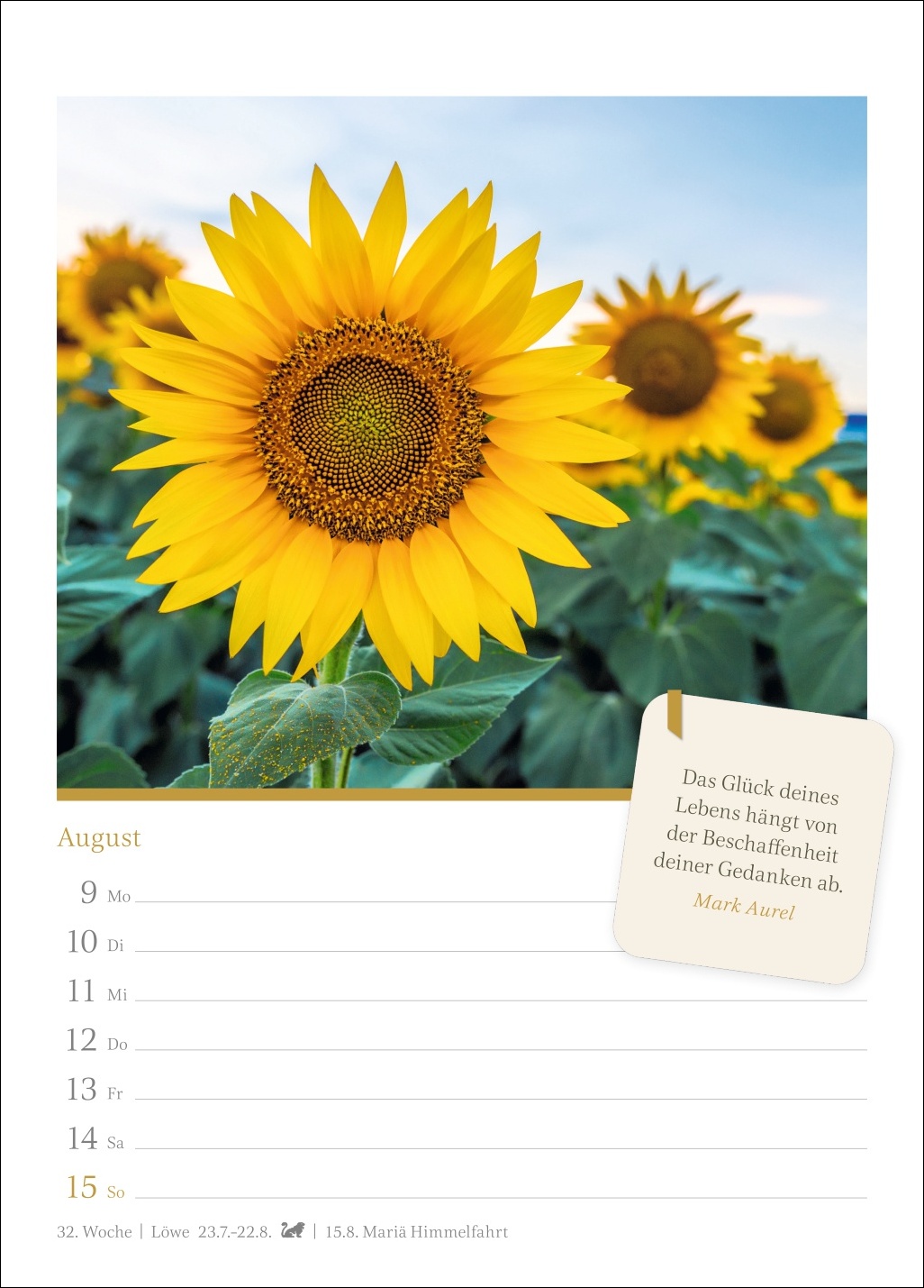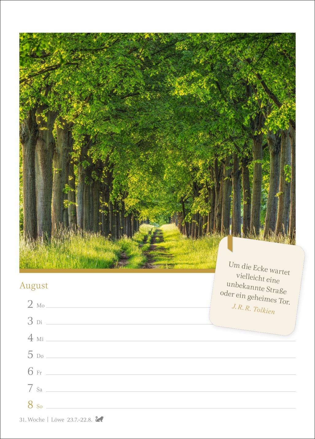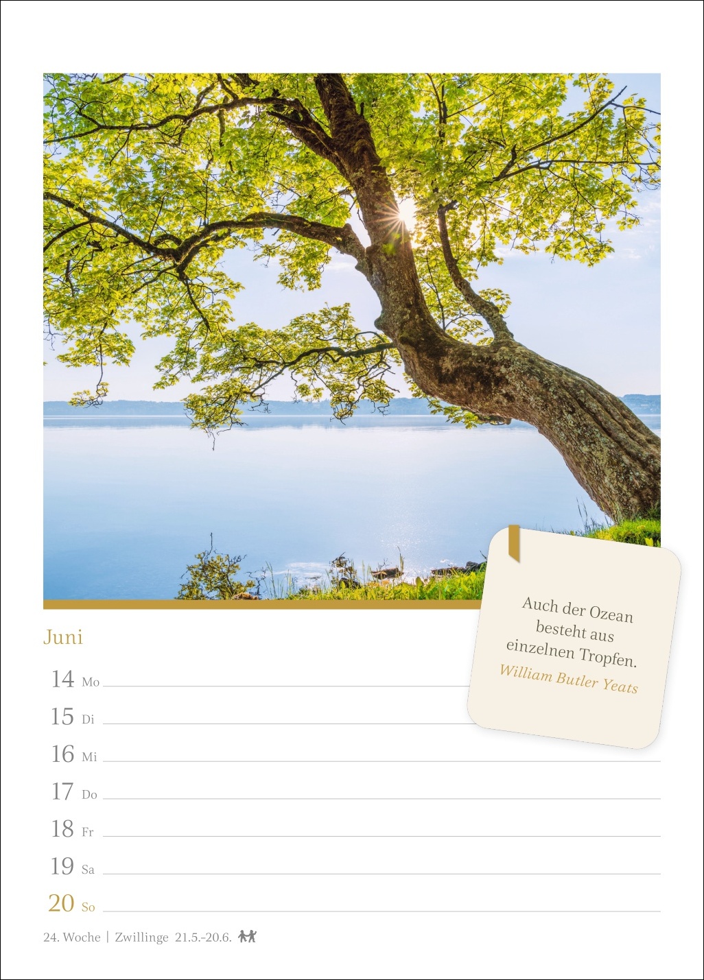- Ein bisschen Gelassenheit im Alltag und sich trotz vollen Terminkalenders Momente der Ruhe gönnen: Dazu regt dieser Wochenkalender mit schönen Bildern und motivierenden Worten an