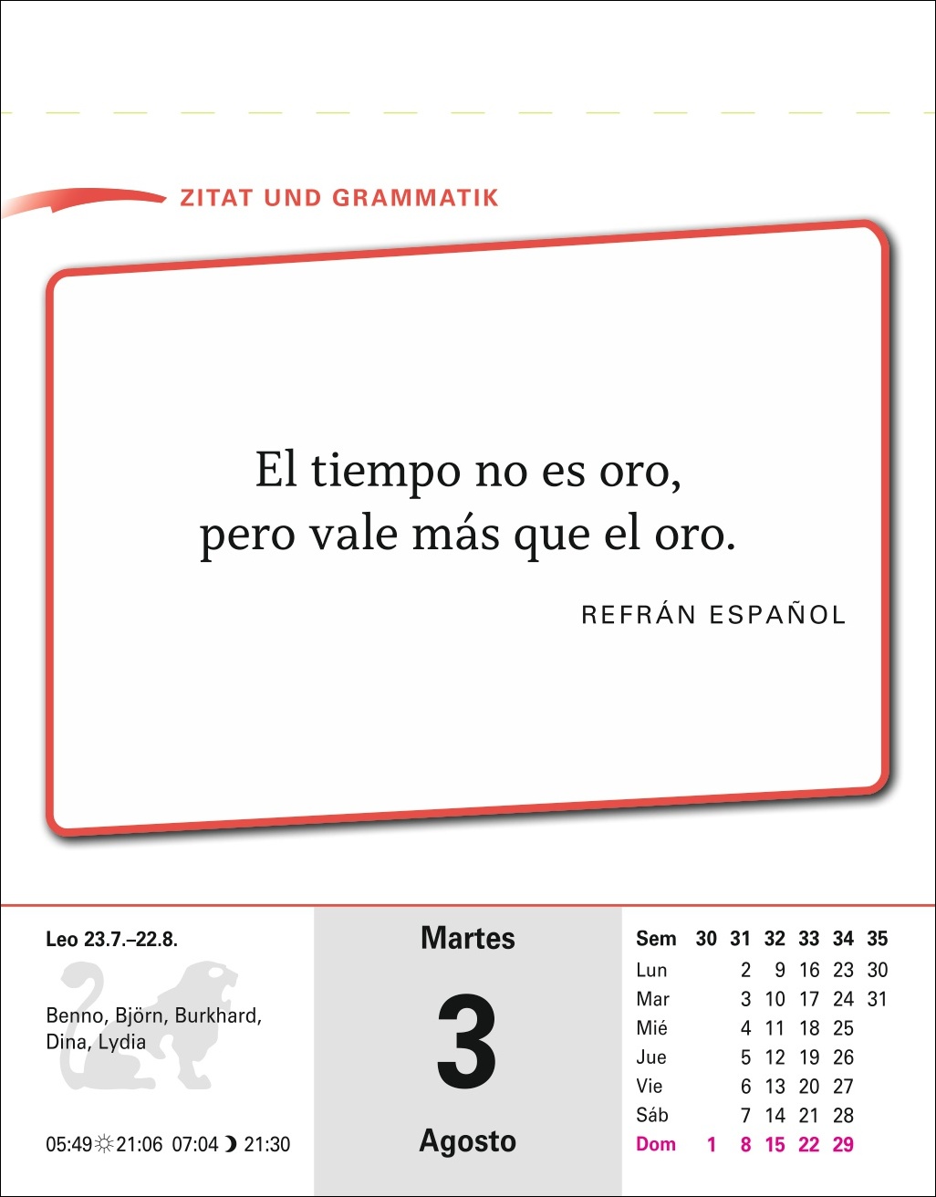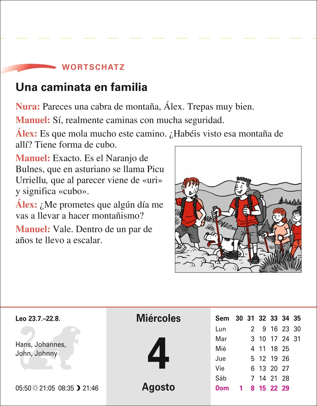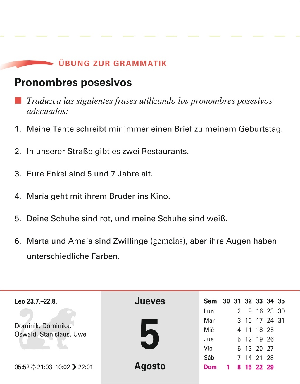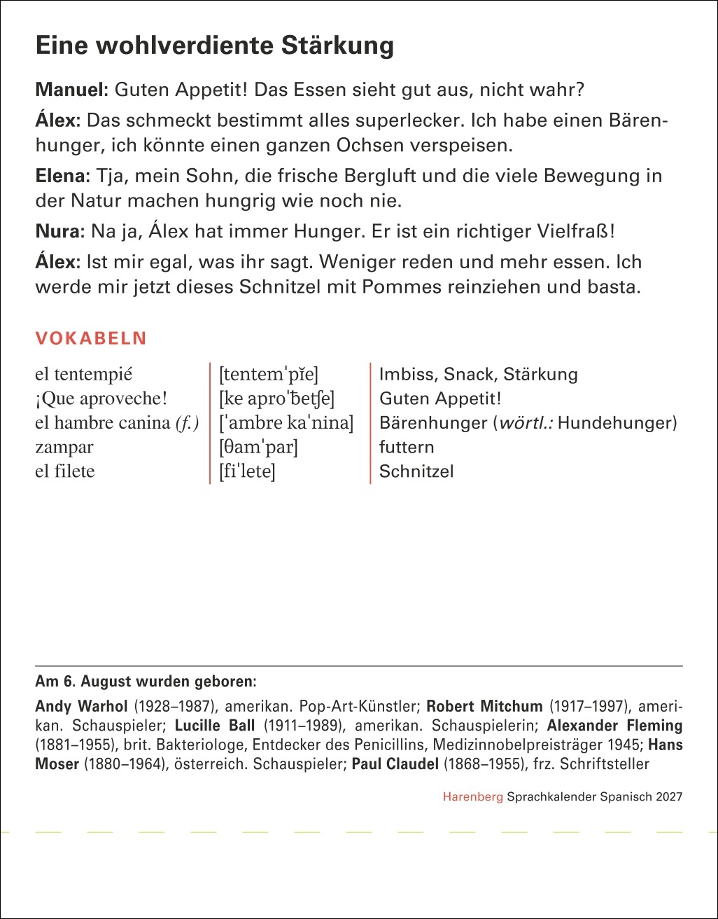• Ein Abreißkalender mit mehr als 600 Seiten Alltagsdialogen, Landeskunde, verständlich erklärter Grammatik und abwechslungsreichen Übungen