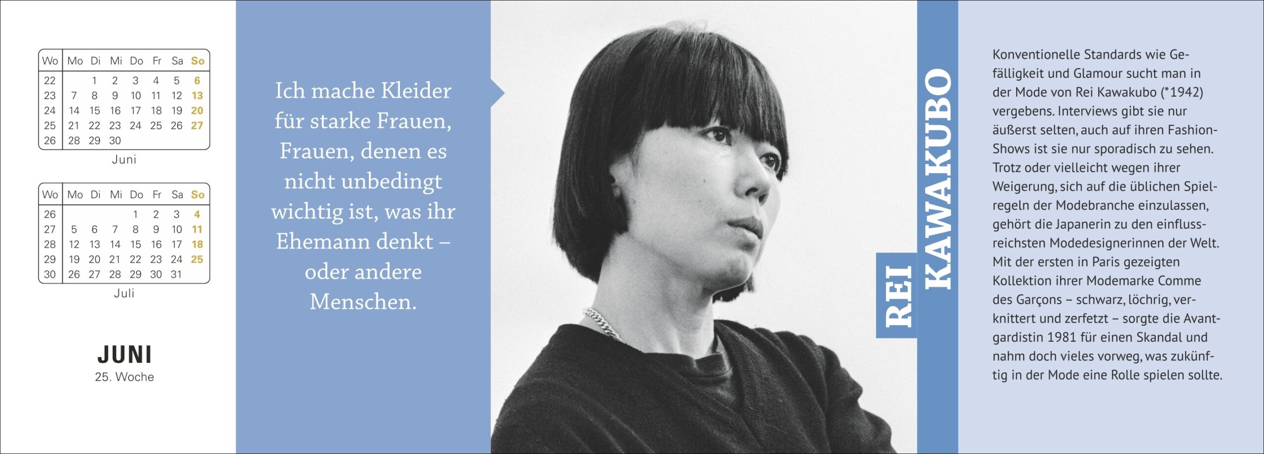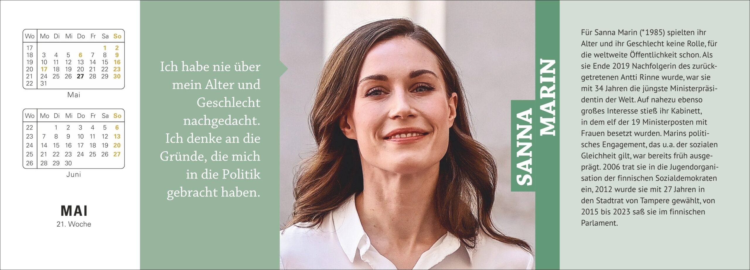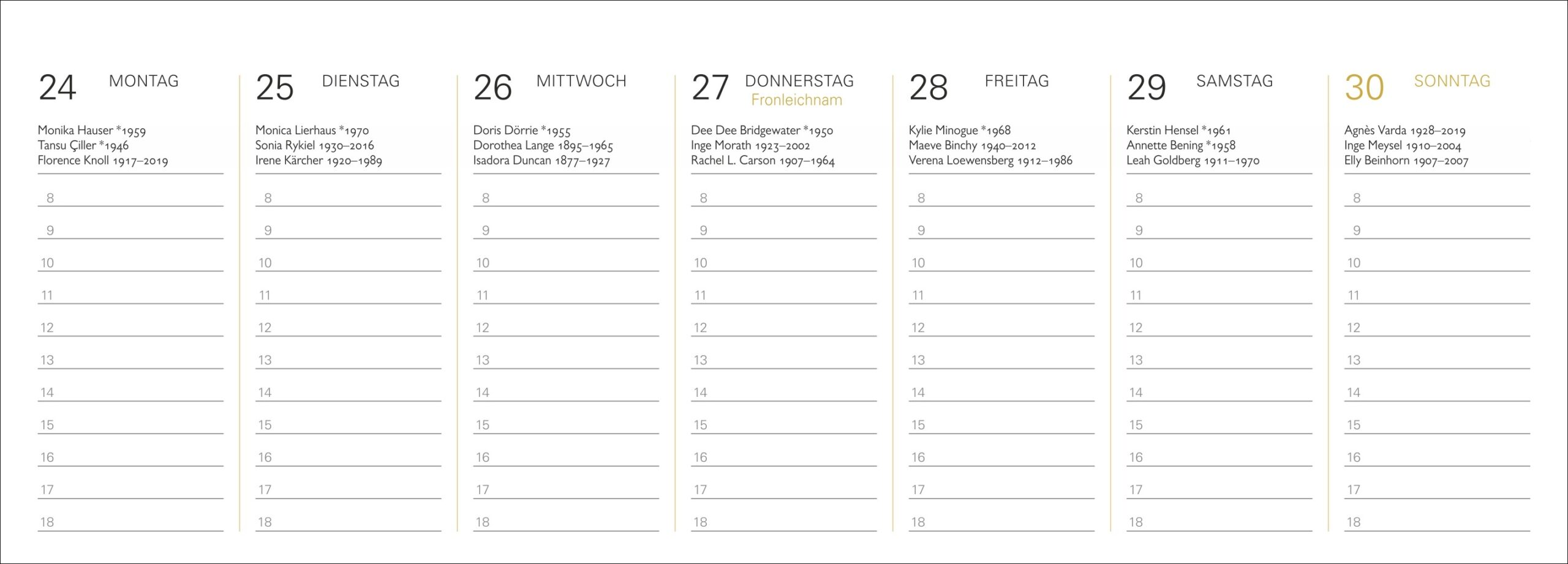 - Weibliche Vorbilder und ihre klugen Worte: Berühmte Frauen-Kalender im Format 29,9 x 11,1 cm mit 2 Seiten pro Woche, Feiertagen und Nennung von bekannten Geburtstagskindern