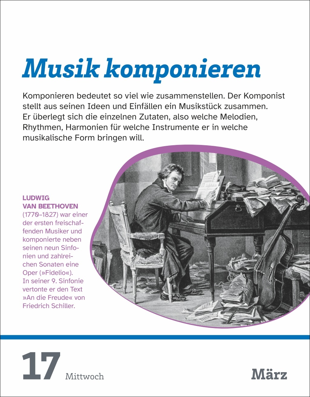 • Jeder Wochentag ein Kalenderblatt, Samstag/Sonntag auf einem Blatt